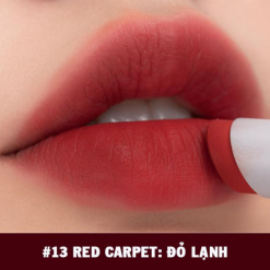 Son Romand New Zero Matte Lipstick 13 Red Carpet là sắc son đỏ thuộc tone lạnh, có ánh tím rất nhẹ và chỉ nhìn rõ khi thoa full môi. Sự kết hợp ánh tím sẽ làm màu son trở nên lạnh và kiêu kỳ hơn. Màu son này không hề kén da nên có thể dùng đẹp với mọi phong cách.